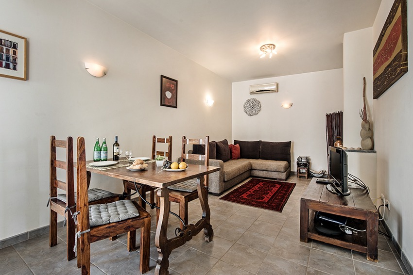 The accommodation is spacious, with an open-plan feel and consists of a comfortable living room with wood burner and dining area, a fully equipped kitchen (electric hob & oven, microwave oven, fridge/freezer, dishwasher, toaster, kettle, no washing machine) with granite work surfaces, a double bedroom ( 2 single beds, can be made up as either twin beds or king-size bed) and ample wardrobe space, a good size stylish bathroom with shower. Satellite TV (International free to air channels), DVD player, Air Conditioning for additional heating and cooling. All windows are traditional in style with double glazing.. The private balcony is perfect for enjoying breakfast.