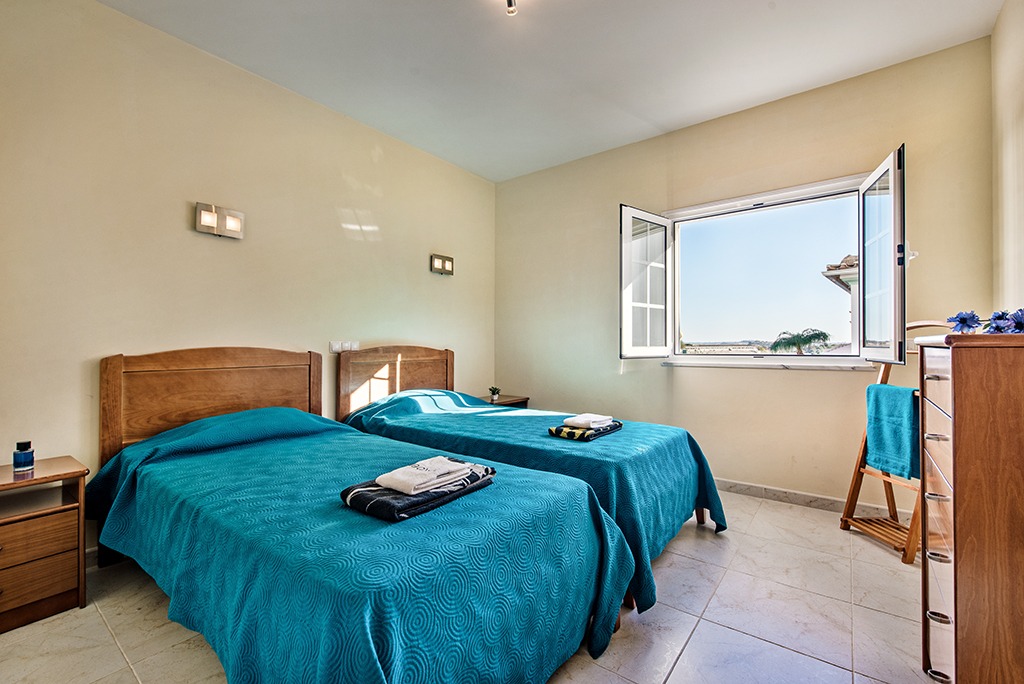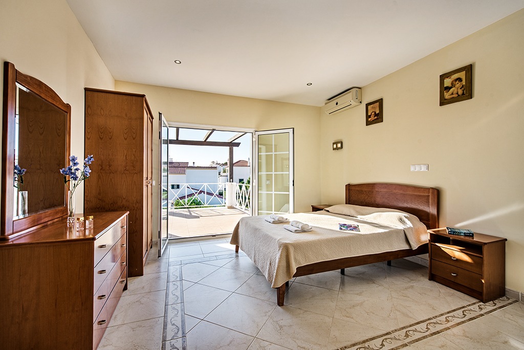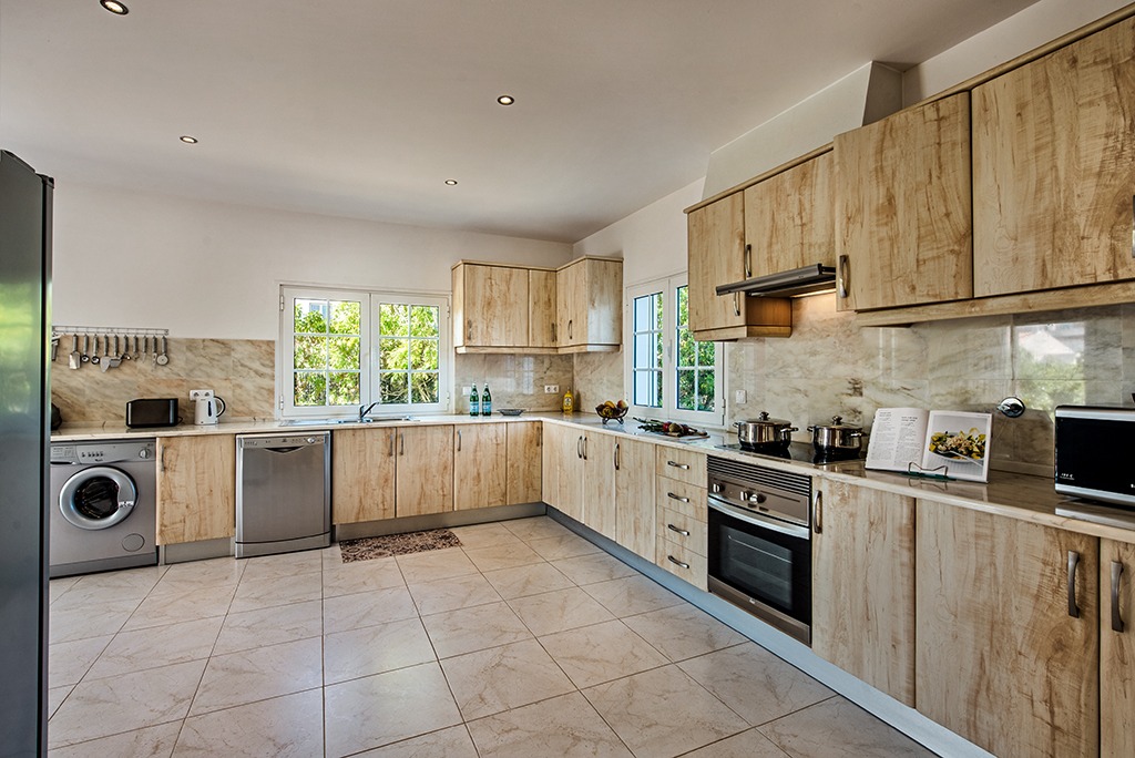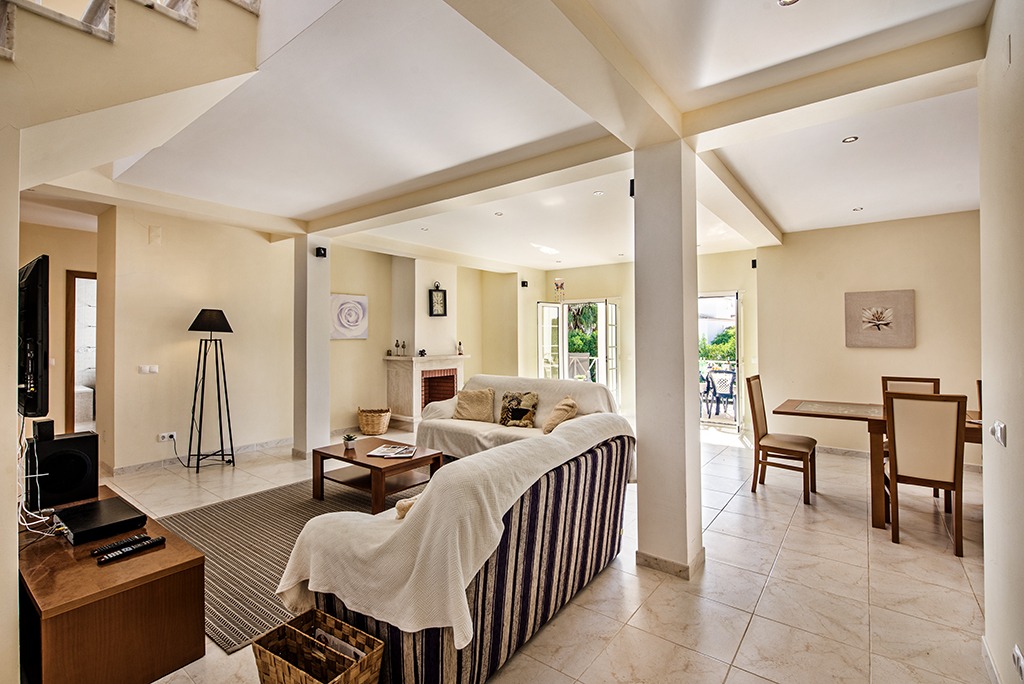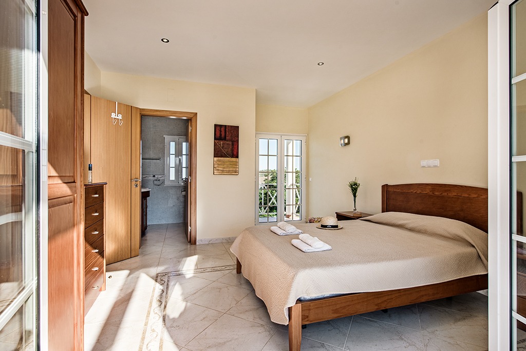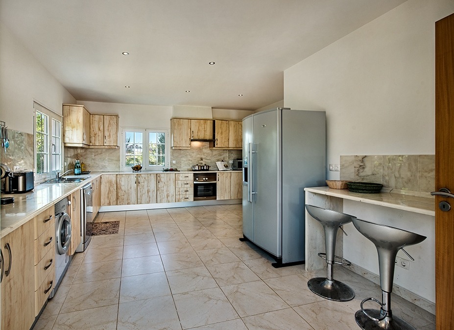 This luxury South-facing villa consists of a hallway with a large central staircase and leads to an open plan living room with fire place. The very spacious and fully equipped kitchen with American Fridge freezer is brilliant for self caterers. Adjacent to the kitchen you’ll find the dinning room. The two double bedrooms and a bathroom with shower and a guests bathroom with W.C. complete the ground floor. In total there are 4 bathrooms of which two are en-suite.