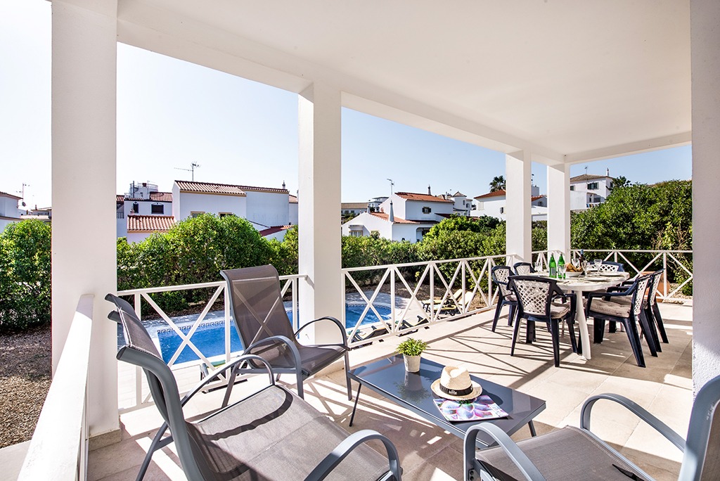 Access from the living room to a semi-covered terrace with table and chairs and the swimming pool with sun terrace and sun loungers.