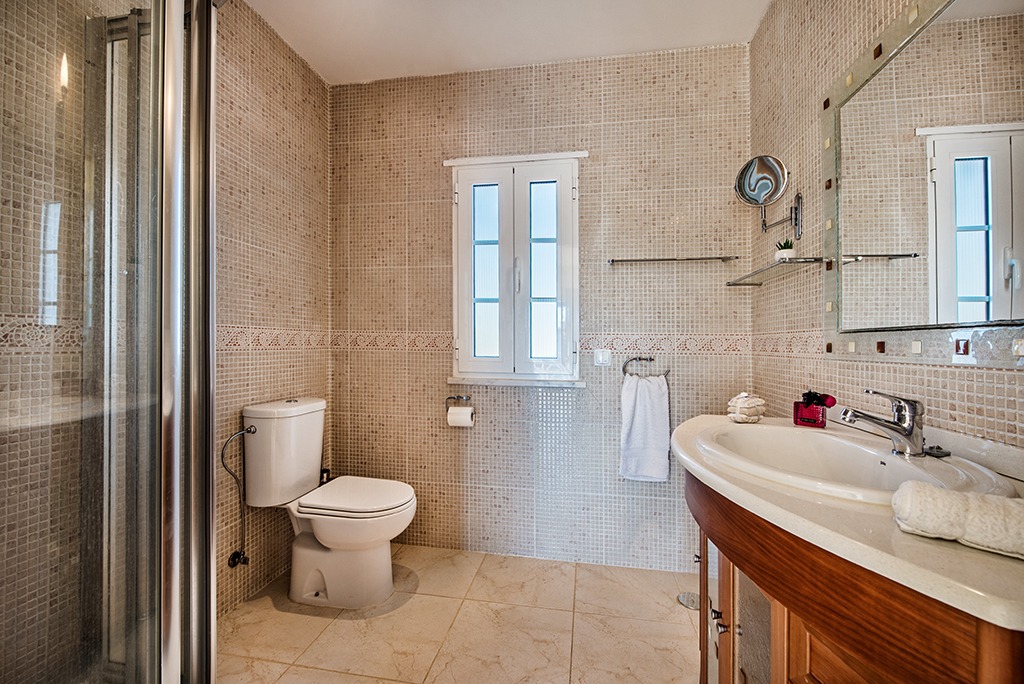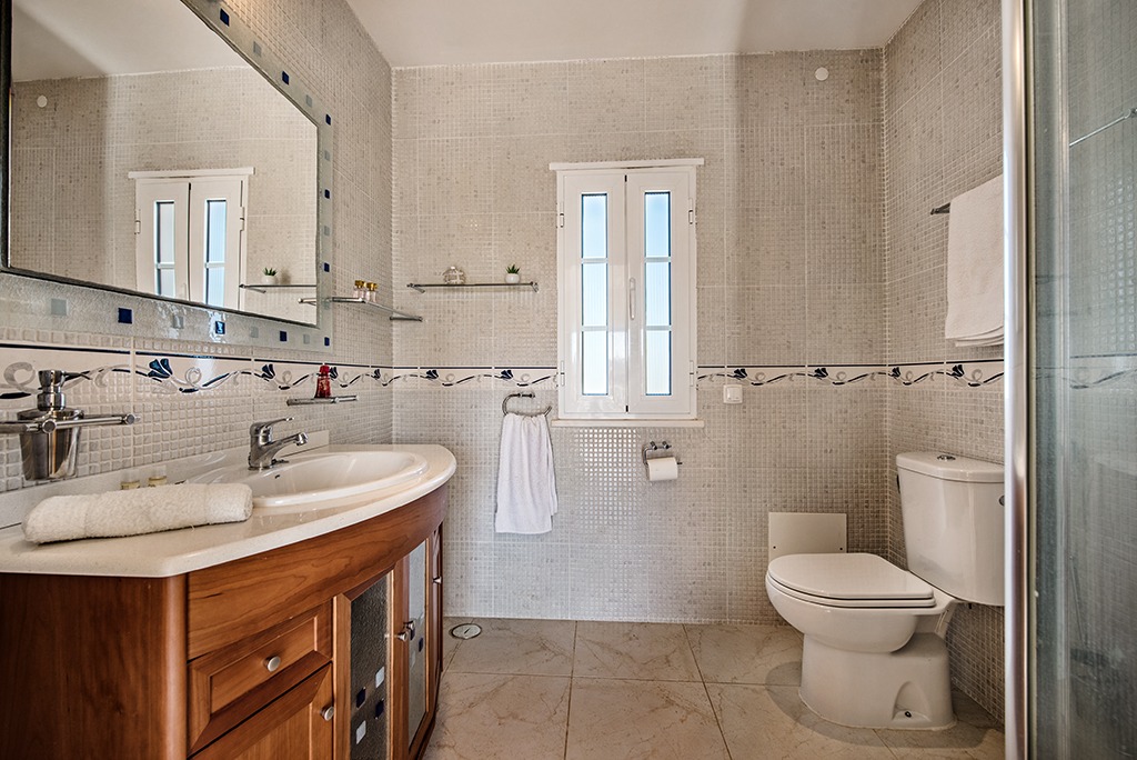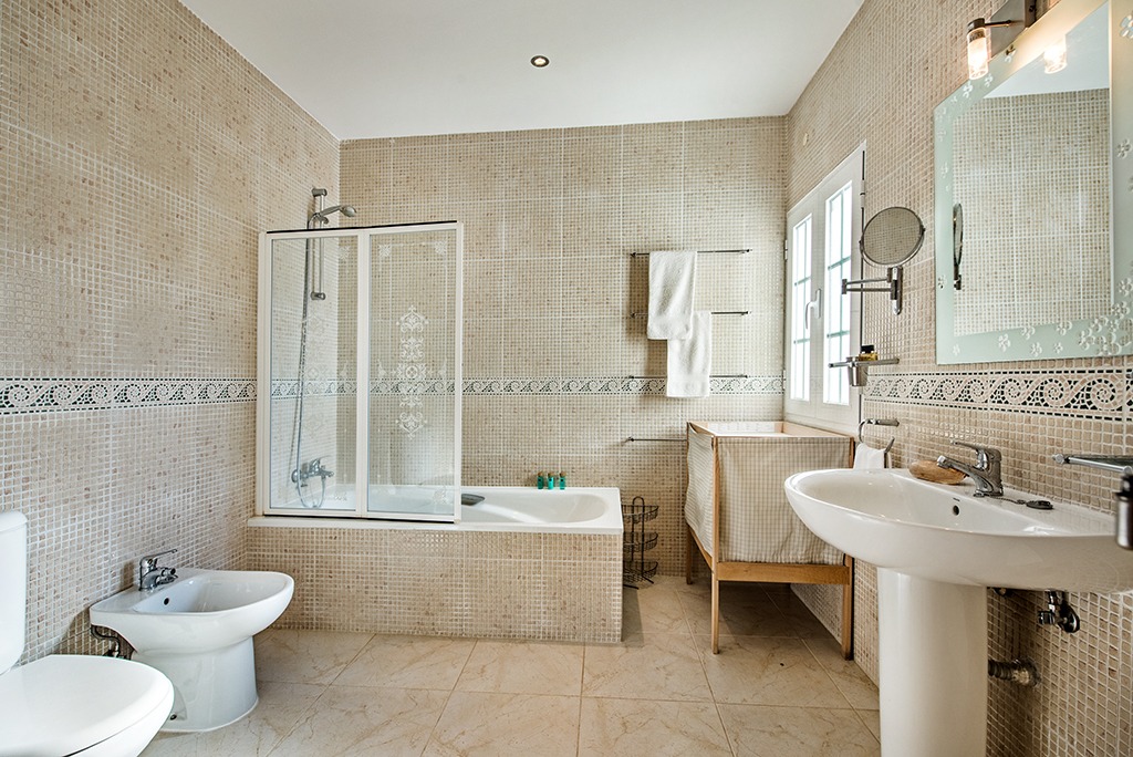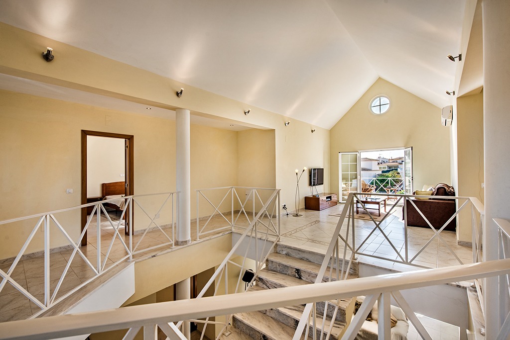 From the hallway an open staircase leads to the landing on the 1st floor, comprising a spacious (2nd) TV seating area with air conditioning, two double bedrooms and two bathrooms. Access from both the landing and bedrooms onto a south facing sun terrace.