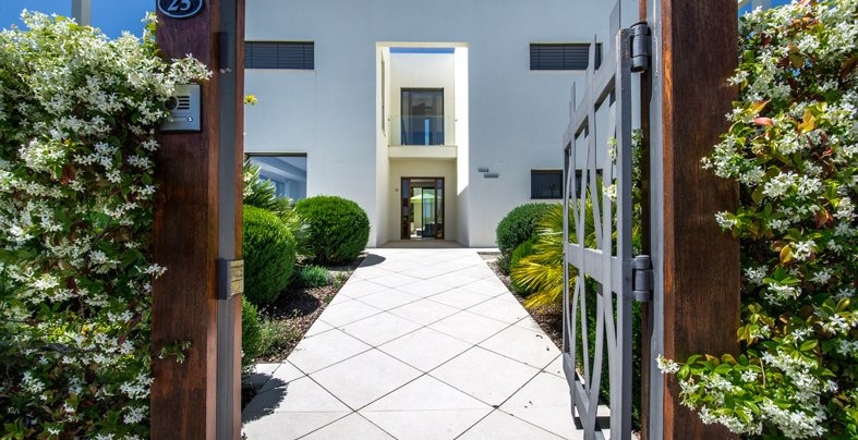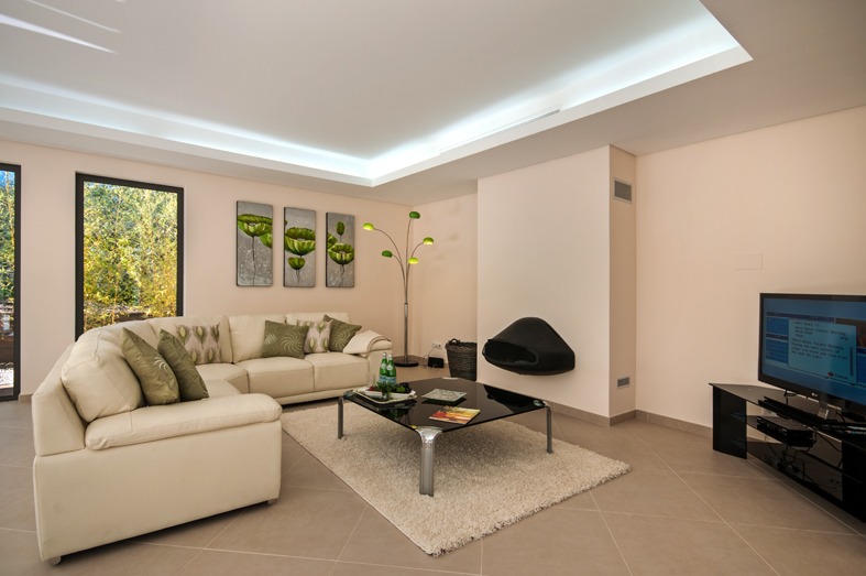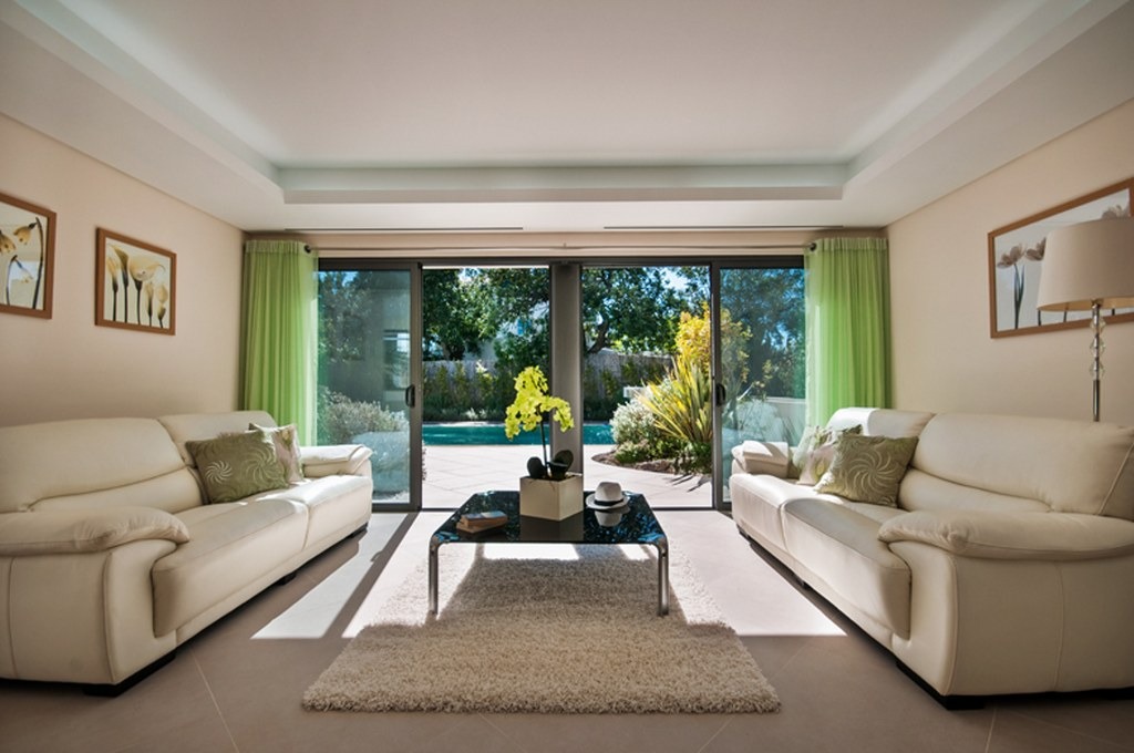 The villa is set within its own private gardens on a fully fenced plot of land. Access to the property is gained via an electronic gate for cars and intercom system (CCTV) for pedestrians. The ground floor consist of a hallway with guest W.C. leading to the large living room with various seating areas and fireplace (wood burner stove), a very spacious fully equipped designer kitchen with natural stone worktop and breakfast bar, a large American style fridge/freezer, a wine fridge, an electric hob, a microwave oven, kettle, toaster and ample kitchen cabinets for storage. This kitchen offers everything you need and more! Adjacent to the kitchen you’ll find the good size dining room. Immediately next to the dining room, through floor to ceiling sliding windows you have access to the semi-covered terrace with table and chairs; an ideal spot for having breakfast, a well deserved long lunch or an alfresco dinner. This property impresses with large ‘floor to ceiling’ windows bringing the vistas of the outdoors in and offering lots of light.