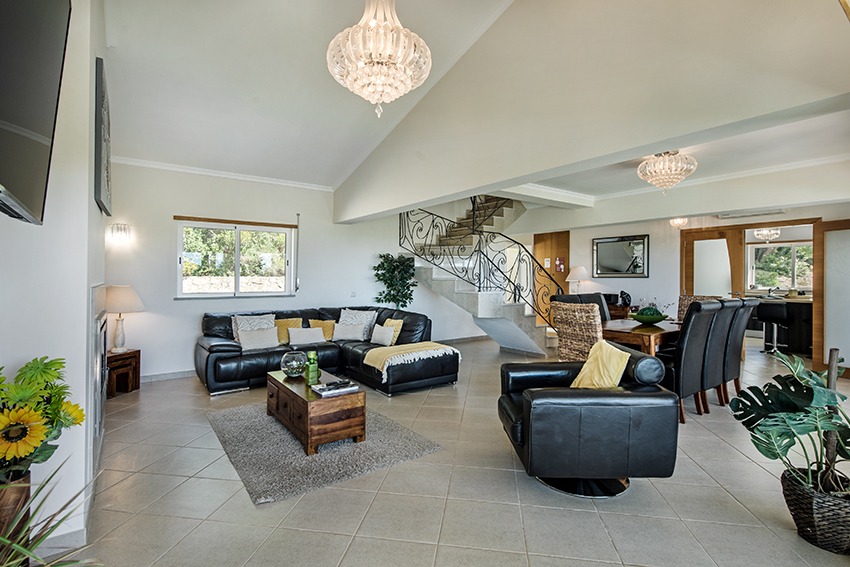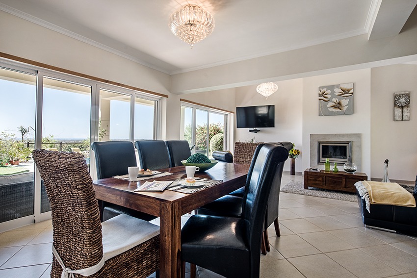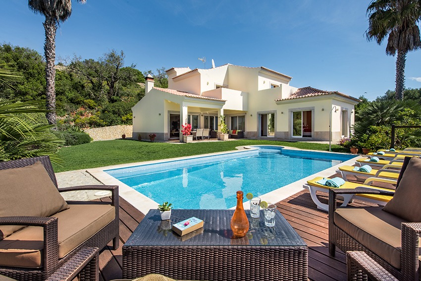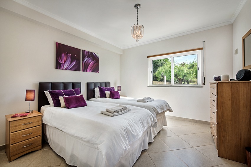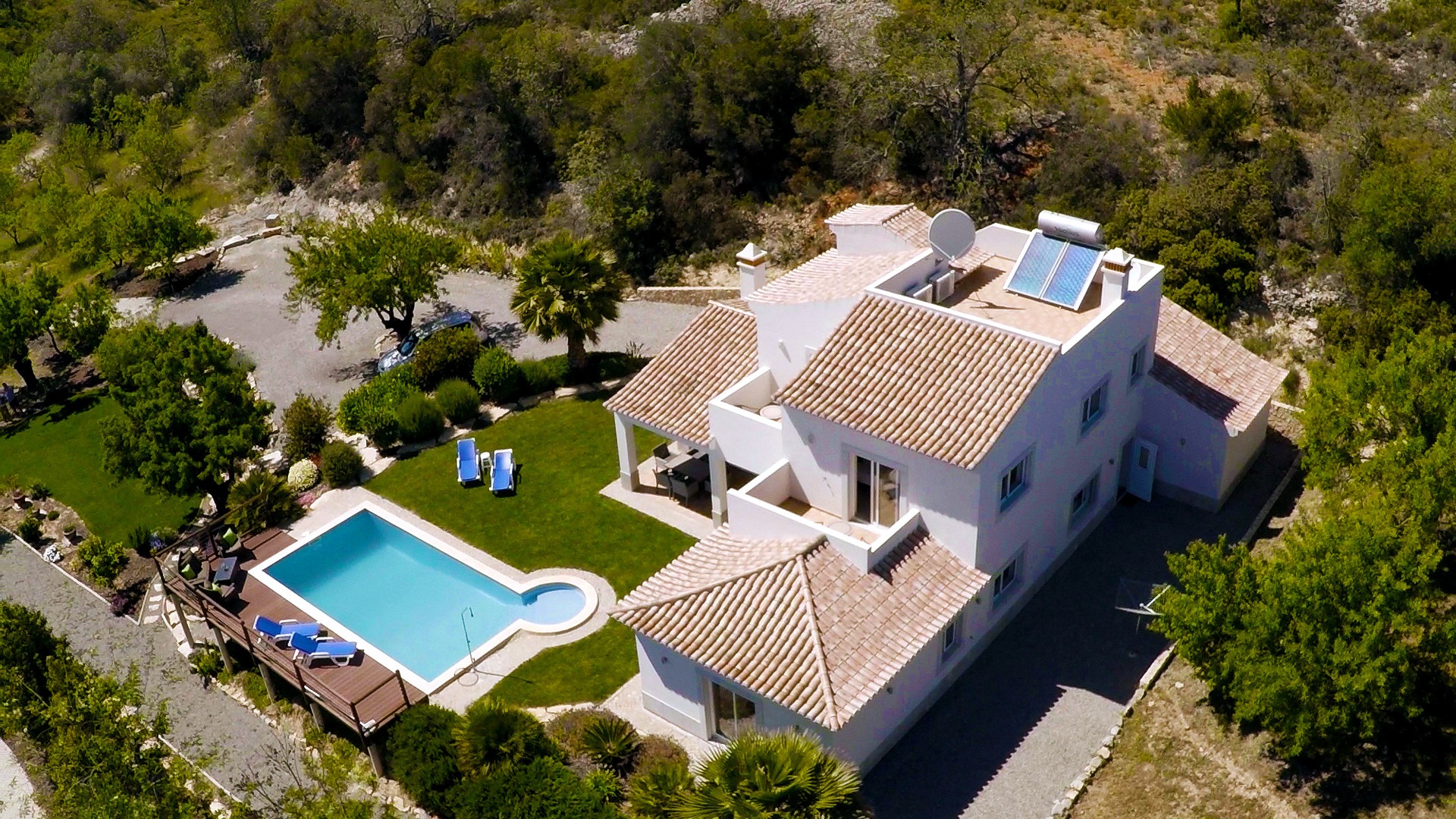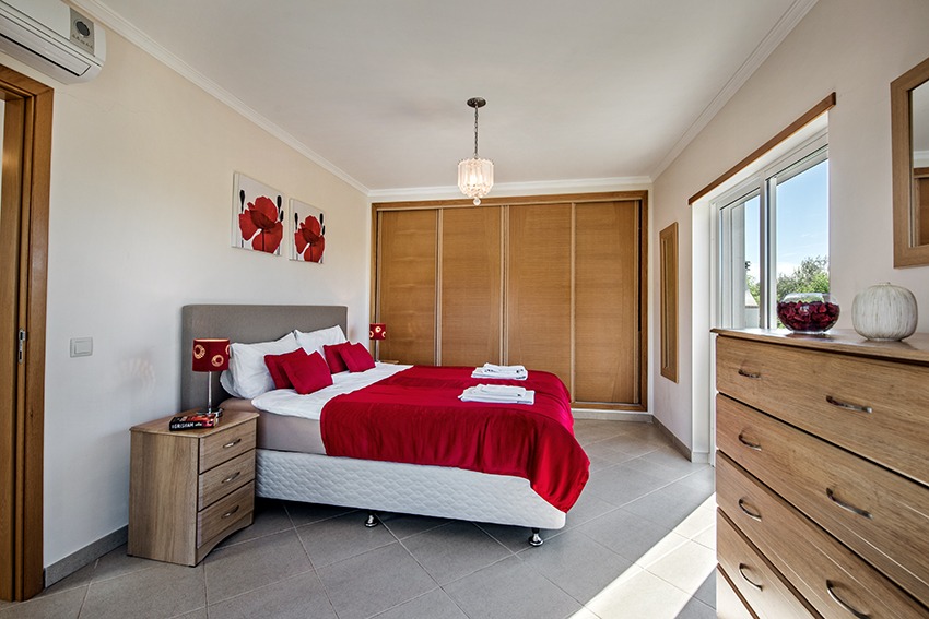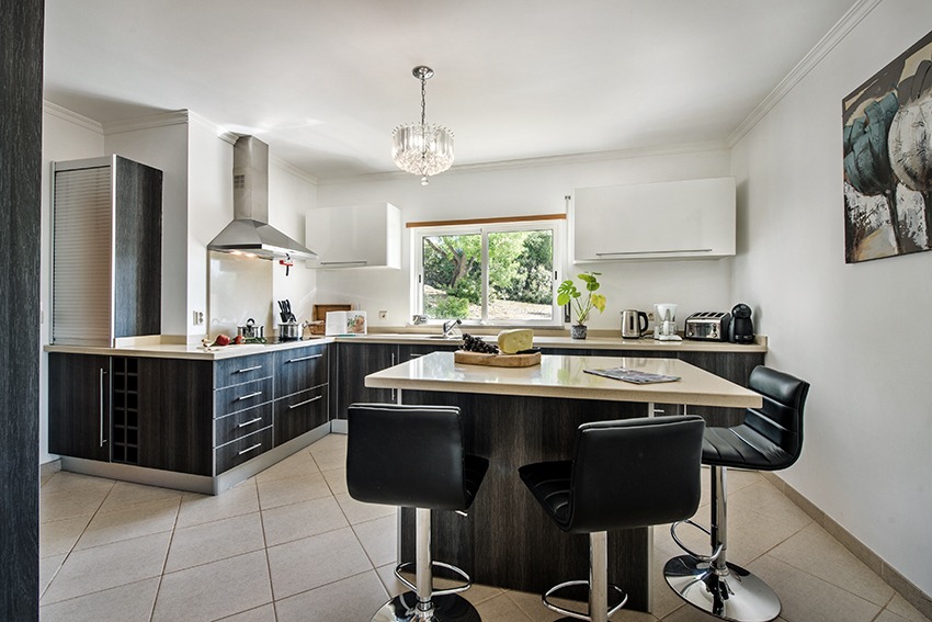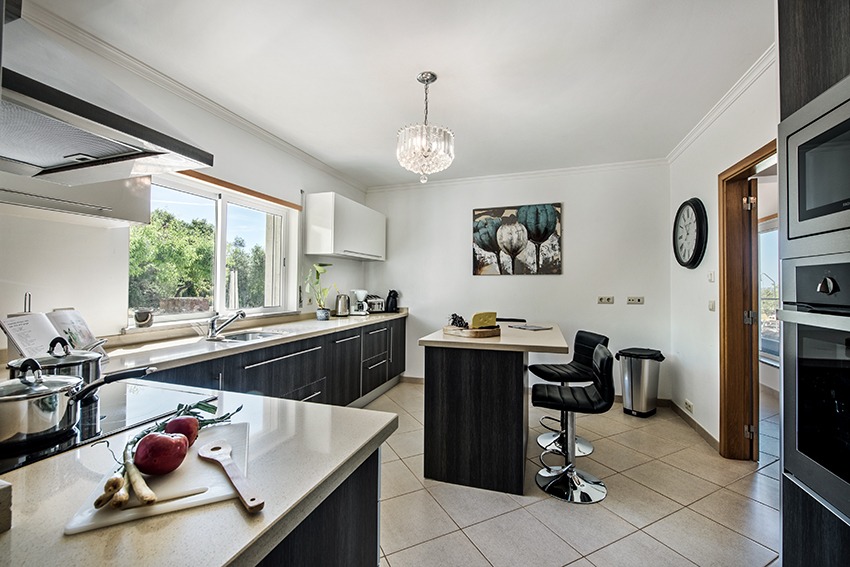 The villa has a nice open plan lay out, modern furniture with a Mediterranean ambiance and is very well equipped and consists of a spacious – light and bright- living room with wood burner stove and dining area. Adjacent to the dining area is a large and fully equipped designer kitchen with breakfast island and natural stone worktop. Two double bedrooms sharing a bathroom. The first floor is reached by a natural stone staircase with beautiful cast iron banister and comprises two double bedrooms, both with access to a south facing terrace with sea view and table and chairs, two bathrooms (large master bedroom with flat panel TV and one en-suite). There are two bedrooms with double bed, and two with twin beds. All bedrooms are of good size and have built-in wardrobes. Access from the living room, kitchen and one ground floor bedroom to the (partly) semi-covered terrace, lawn and swimming pool. The garden is partly landscaped, automatically irrigated and has many mature – beautiful- trees. In addition, a large BBQ is provided as well as sun loungers by the pool for the guests to be used. In front of the living room, under the semi covered terrace, you’ll find a cosy seating area. Air conditioning in all rooms. An ideal holiday home close to the village of Santo Estevao with lovely restaurant and shops. Good access by tarmac road, central location.