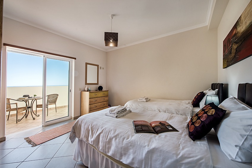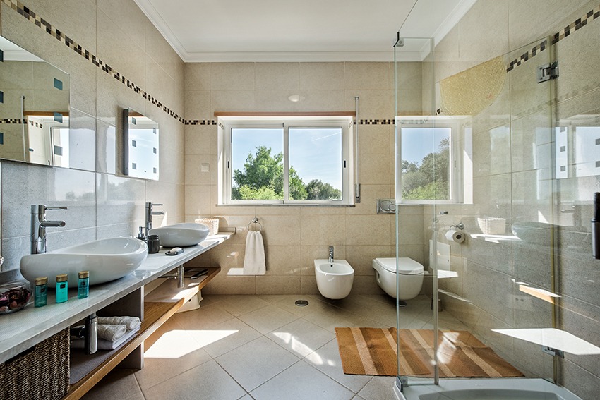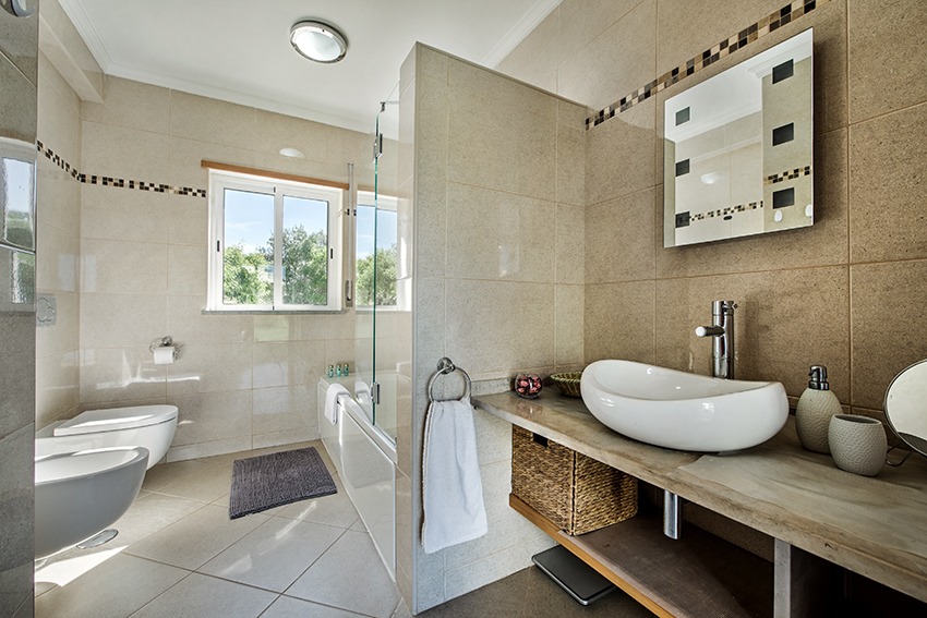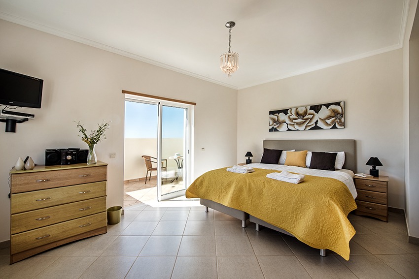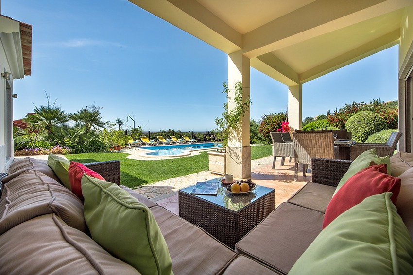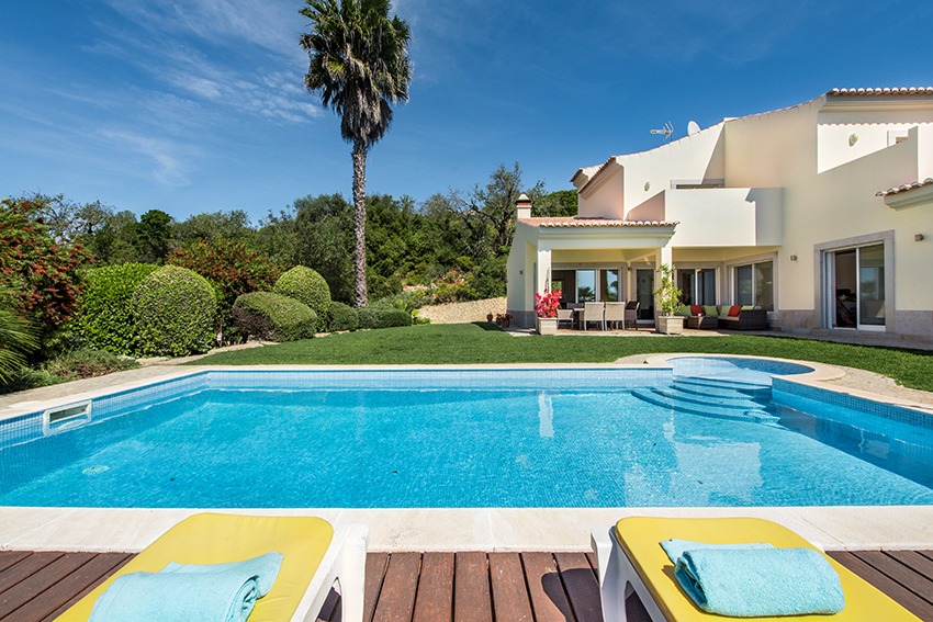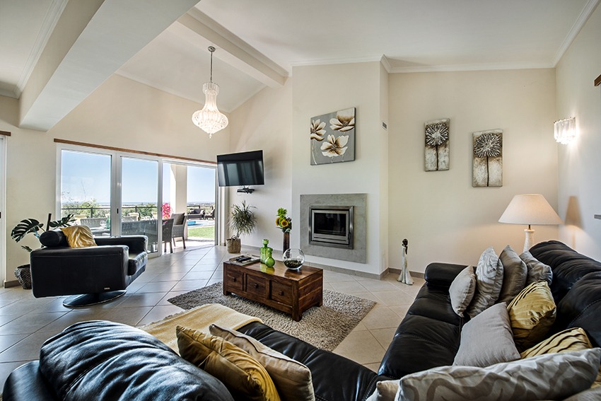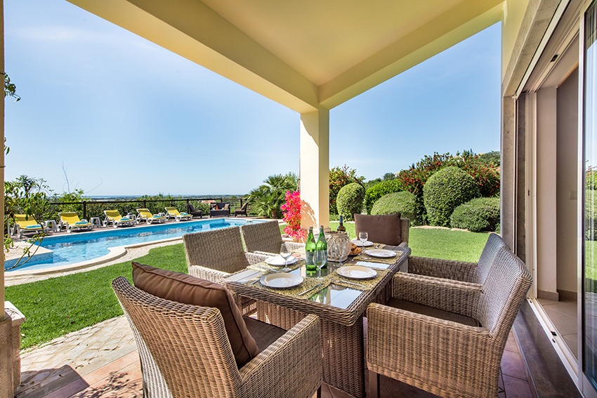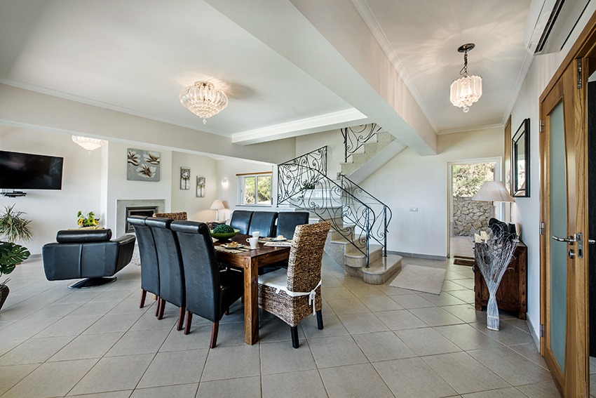The villa has a nice open plan lay out, modern furniture with a Mediterranean ambiance and is very well equipped and consists of a spacious – light and bright- living room with wood burner stove and dining area. Adjacent to the dining area is a large and fully equipped designer kitchen with breakfast island and natural stone worktop. Two double bedrooms sharing a bathroom. The first floor is reached by a natural stone staircase with beautiful cast iron banister and comprises two double bedrooms, both with access to a south facing terrace with sea view and table and chairs, two bathrooms (large master bedroom with flat panel TV and one en-suite). There are two bedrooms with double bed, and two with twin beds. All bedrooms are of good size and have built-in wardrobes. Access from the living room, kitchen and one ground floor bedroom to the (partly) semi-covered terrace, lawn and swimming pool. The garden is partly landscaped, automatically irrigated and has many mature – beautiful- trees. In addition, a large BBQ is provided as well as sun loungers by the pool for the guests to be used. In front of the living room, under the semi covered terrace, you’ll find a cosy seating area. Air conditioning in all rooms. An ideal holiday home close to the village of Santo Estevao with lovely restaurant and shops. Good access by tarmac road, central location.