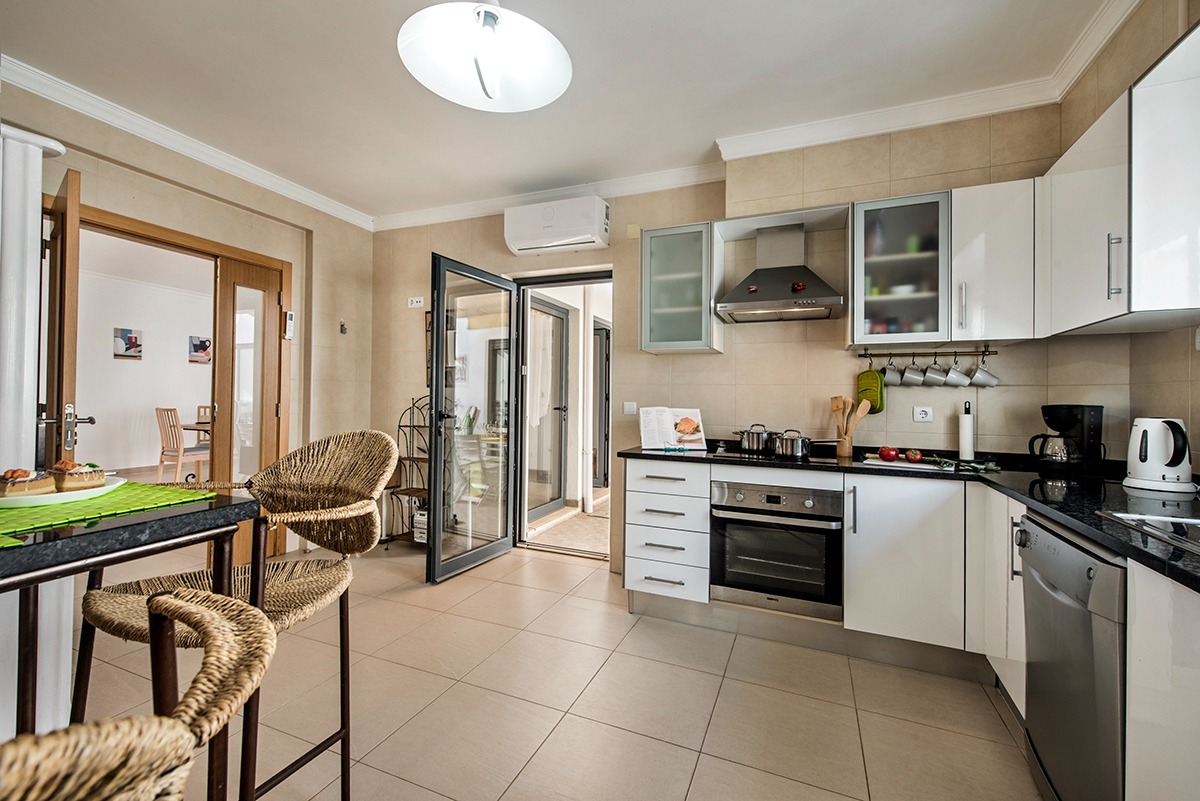 The open plan lounge and dining area offers plenty of space to relax and is equipped with a flat screen TV with local and international channels via the MEO network which also provides the Wi-Fi internet connection. The fully equipped kitchen has all the appliances, cookware and utensils you may need.