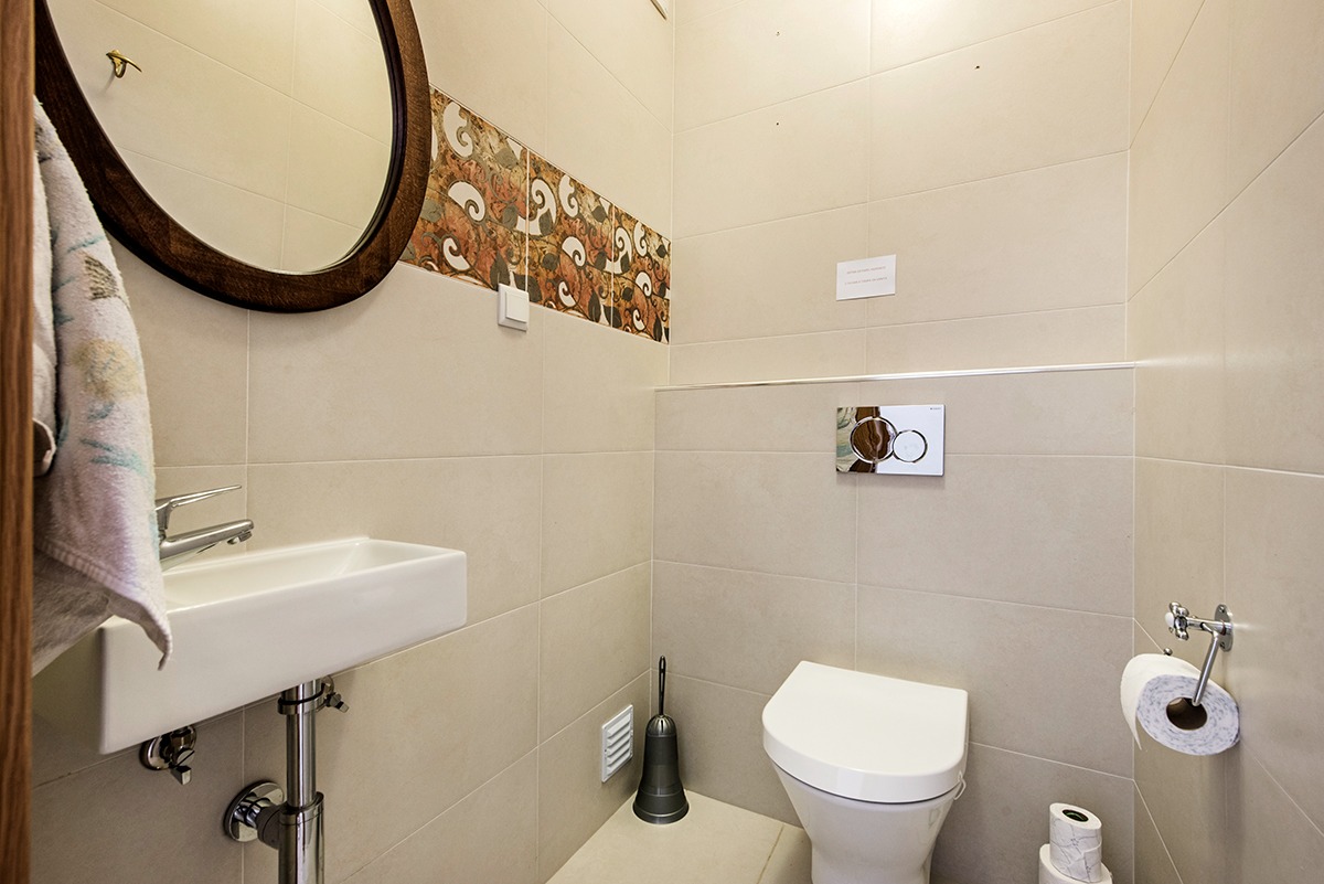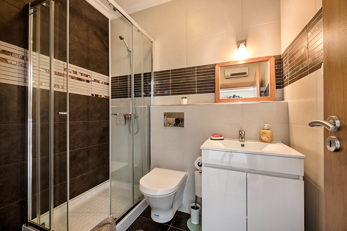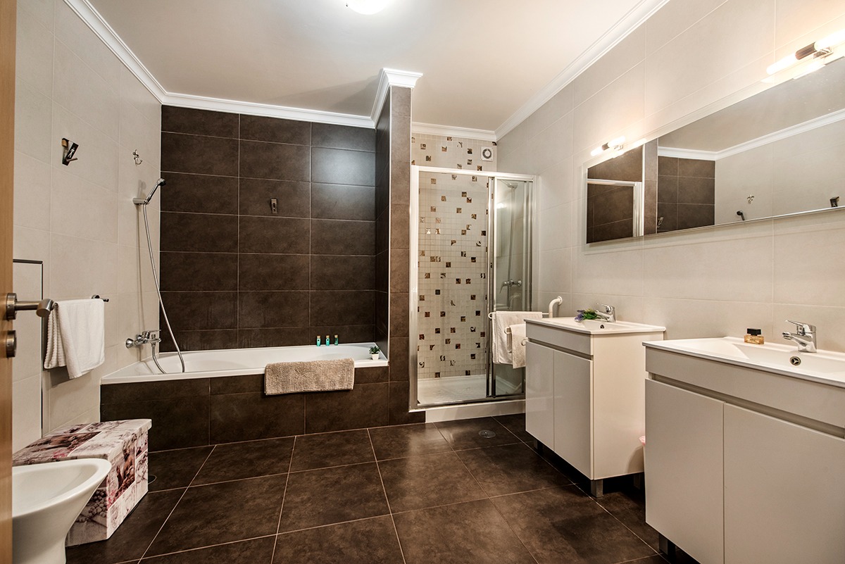 Each bedroom has built-in wardrobes, air conditioning and direct access to the private terrace. Two of the bedrooms have twin beds, while the master bedroom has a double bed and its own bathroom with shower. The main bathroom is very spacious with double sinks, a bathtub, a separate shower, and a bidet. There is also a guest bathroom for added convenience.