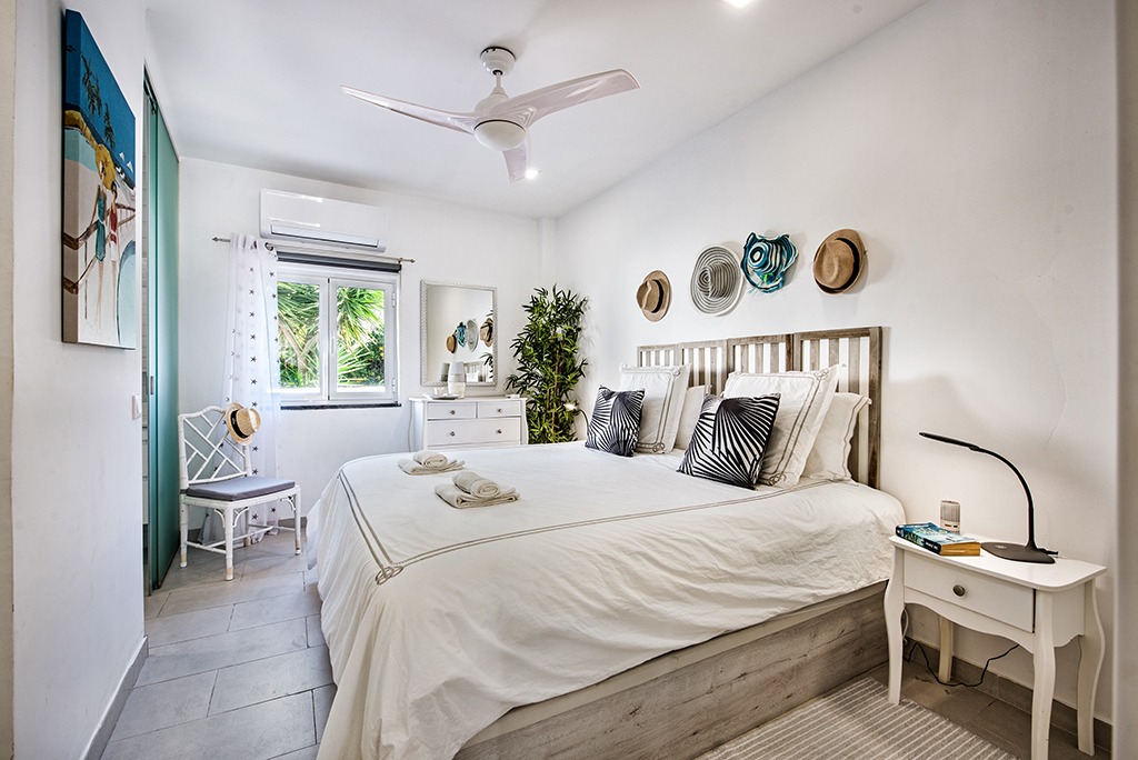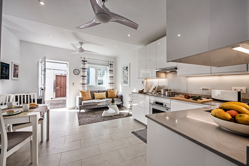 Well presented recently renovated village house with garage in the historical centre of Tavira with view of the old castle walls. The property consists of a living room with fully equipped kitchen and dining area – all in open plan design – and a good size double bedroom with en-suite bathroom with walk in shower. The 1st floor comprises of a light and bright second bedroom with king-size double bed and en-suite bathroom and walk in shower, a large private terrace with table and chairs, sunloungers, BBQ and seating area. From here you can enjoy ample sunshine and views of the old city centre. There is an additional fridge as well as a kettle, cafetiere in the 2nd bedroom adjacent to the terrace, ideal to keep refreshments cool. In addition to having air conditioning in all rooms, the living room and bedrooms also have ceiling fans for those who prefer not to use air conditioning.