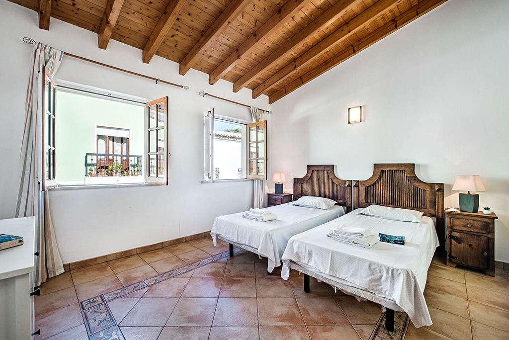 The accommodation is well presented and tastefully decorated and has a very nice ambiance. Each townhouse consists of a lounge with and dining area, a fully equipped kitchen with dishwasher, cooking hob and electric oven, microwave oven and a fridge. Bathroom and storage room with freezer. Staircase leading to the first floor which comprises of two good size double bedrooms with high ceilings made of wooden beams, wooden built-in wardrobes, a bathroom with bath. One of the bedrooms has a terrace overlooking the swimming pool. The swimming pool (8 x 4 mtr.) and surrounding terrace with sun loungers is for communal use. The property has a private terrace with table and chairs. All bedrooms have air conditioning for heating & cooling. Each house has a flat panel LCD TV, satellite TV and DVD player. A true home away from home. The capacity of the townhouse is 4 adults, however additional beds for children can be rented.